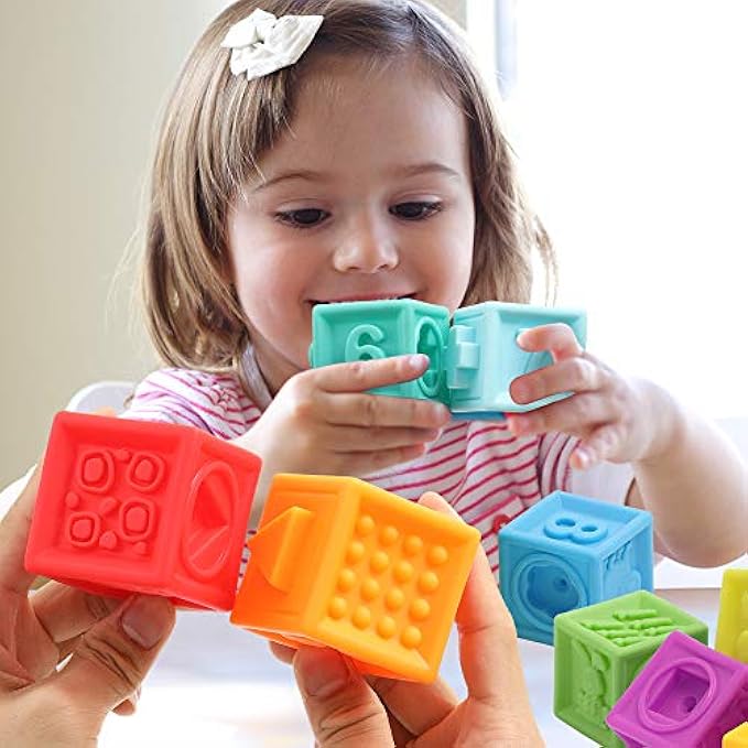 • Early Learning Play - This blocks for babies provides various fun for kids. Super soft and easy to squeeze entertaining baby blocks that make a squeaking sound for toddlers and babies to play. Encourage reaching and grasping, its cute noise help attract the baby's attention. Each side has different learning themes such as numbers, animals, mathematical operations, textures, and building connectors. They are great for toddlers' early educational and motor skills development.