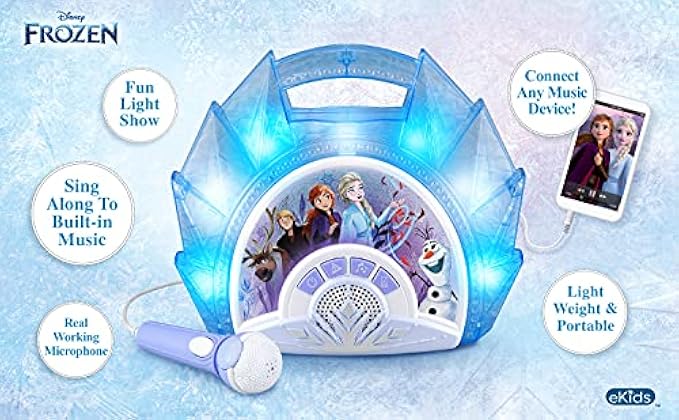eKids Frozen Sing Along Boom Box Speaker with Microphone for Fans of Frozen Toys for Girls, Kids Karaoke Machine with Built in Music and Flashing Lights , Blue, 3.5mm Audio Jack