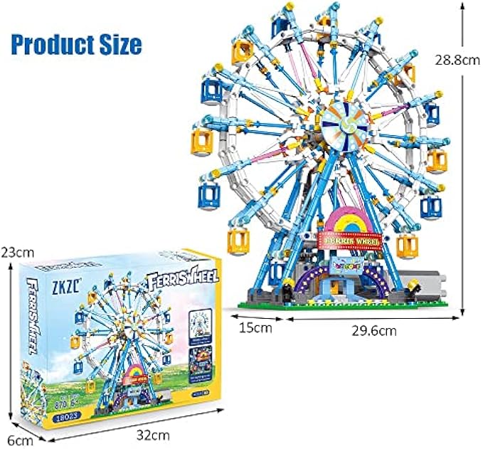 • ?【Amusement Park Ferris Wheel】: Ferris wheel building block set, 879 pieces, height 11.3”, width 11.7”, length 5.9”. 879 colorful Ferris wheel building blocks, colorful LED lights, adjustable two-way lighting, cool Lighting effects, improve children's hands-on ability and build their play world.