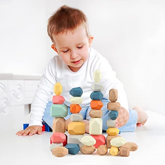 FOPNETS 36 PCs Wooden Sorting Stacking Balancing Stone Rocks Educational Preschool Learning Toys Colorful Large Building Blocks Game Lightweight Wood Stones Set for Kids 3 Years Old
