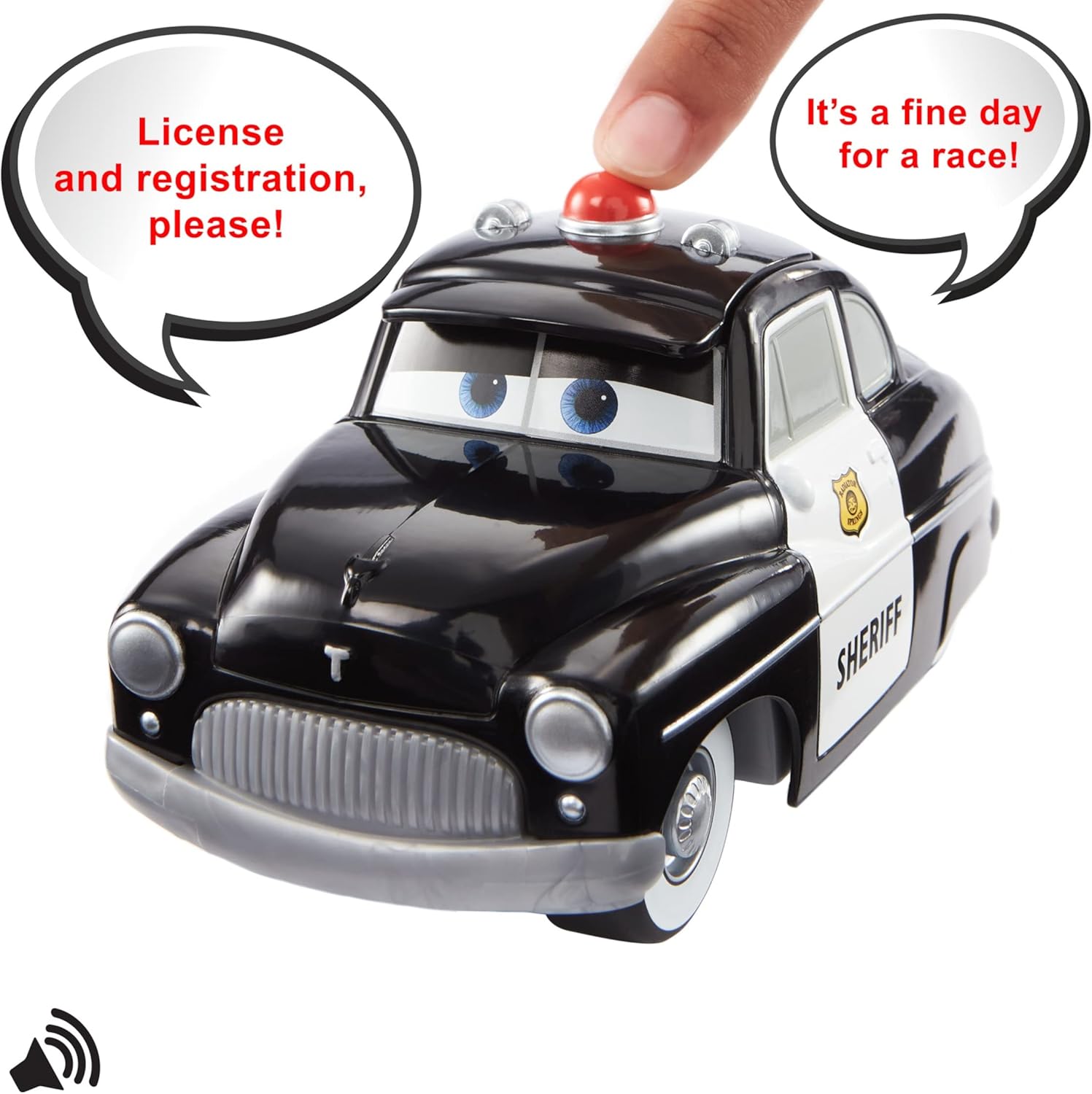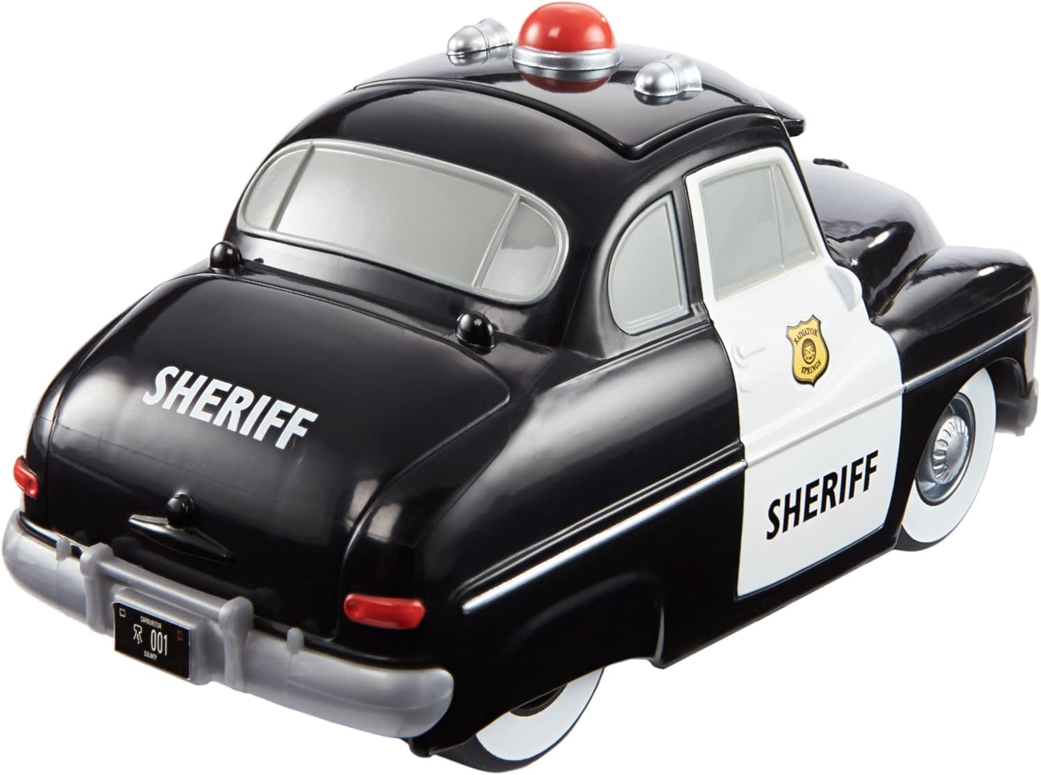 • With just a press of the roof, this Sheriff police cruiser makes sounds from the movies that Cars fans know and will love to repeat!