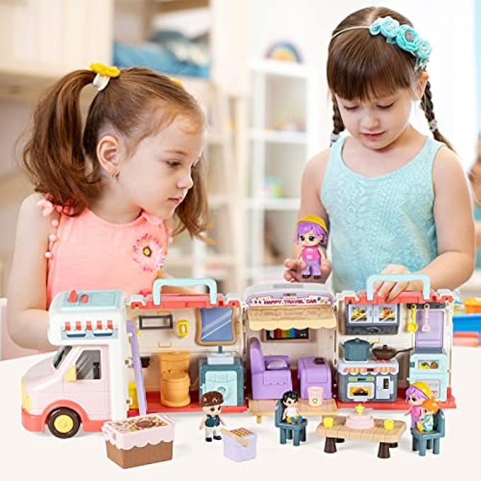 Marstone Doll House Camping Toy, Transforming Doll Camper Dream House with Little People, Pretend RV Van Play Set Girls Toy Inertia Vehicle with Sound and Music for Age 3 4 5 6 7 8+