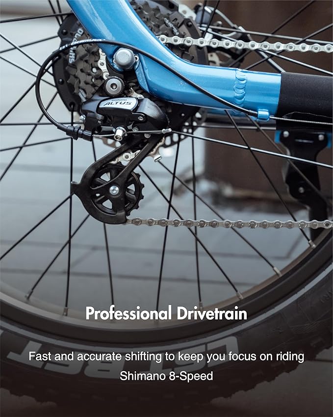 We got all that terrain, Dependable RST hydraulic suspension fork with 80mm travel and lockout, allowing you to tackle various terrains with ease and efficiency. And the 26*4 inch fat tire holds up really well with great puncture protection.