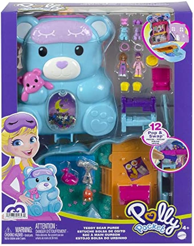 • The Polly Pocket Teddy Bear Purse compact has an adorable teddy bear shape and features a belly area on the exterior with shakable glitter and comes with 2 micro dolls.