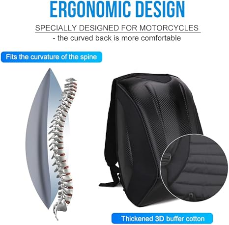 • HIGH QUALITY MATERIAL - The motorcycle backpack is made of carbon fiber, PVC/1680D Oxford. Rugged, water-resistant nylon construction with reinforced carbon fiber PVC body and lid to hold shape even when empty. It also provides some protection for your back in the event of a fall.