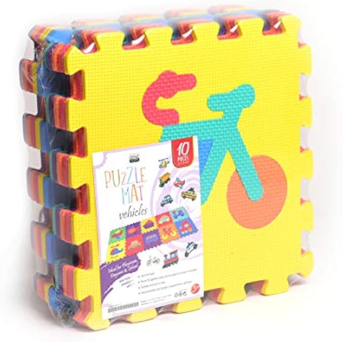 • 10 multi-colored foam interlocking tiles, puzzle mat with vehicle shapes. Easy to use and easy to clean – just wipe with a wet cloth. his floor mat is ideal for homes, play rooms, exercise rooms, daycares and schools.