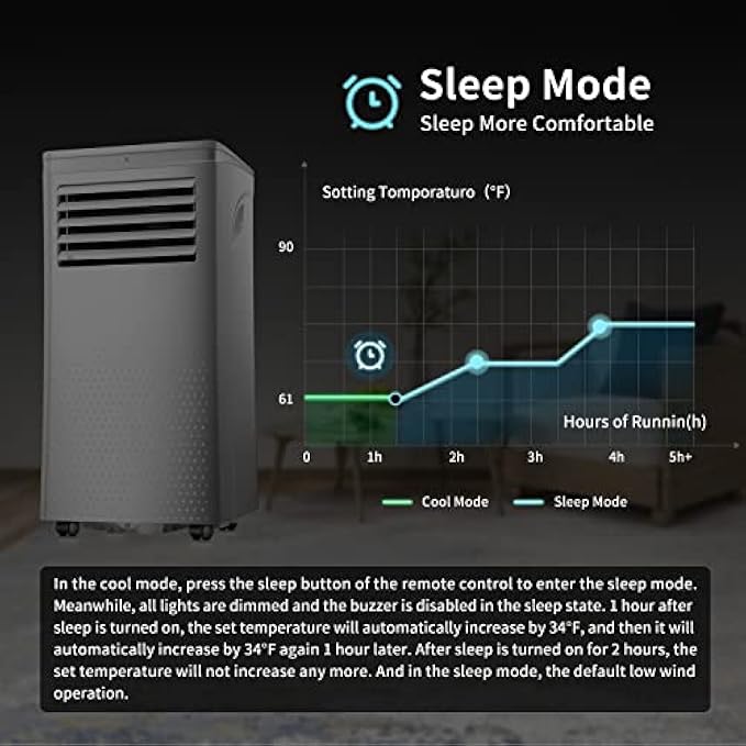 • 【EFFICIENT OPERATION】- The self-evaporating system uses the collected water to cool the condenser oils for a more efficient performance. It is no need to empty the drainage tank in cooling operation, drying operation and high humidity conditions. 24-hr timer. And sleep mode makes it extra quiet while you rest.